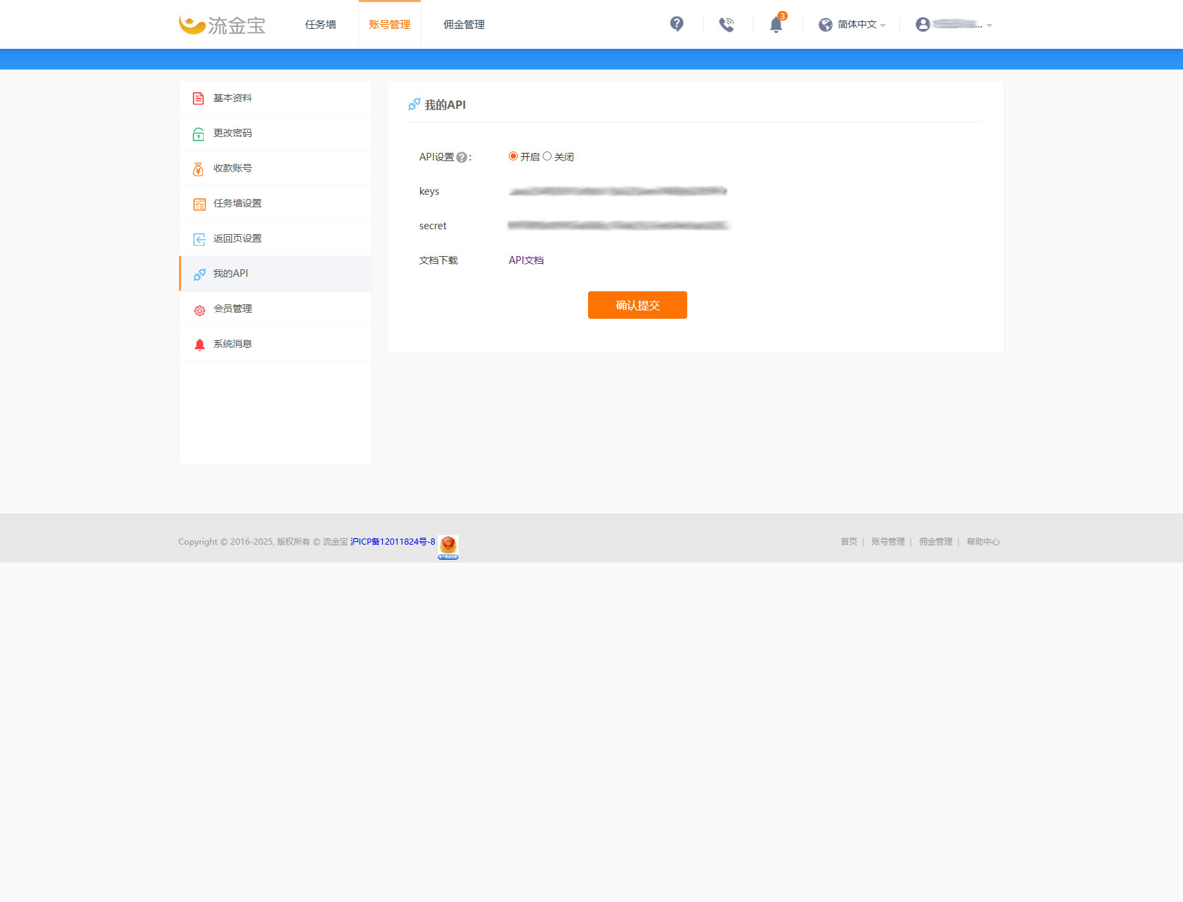 将key和Secret填入,采集开关设置为【开】,保存即可,其他采集选项可以默认或按需要设置